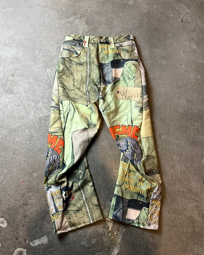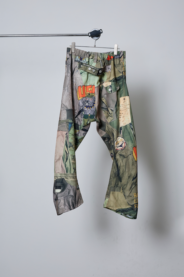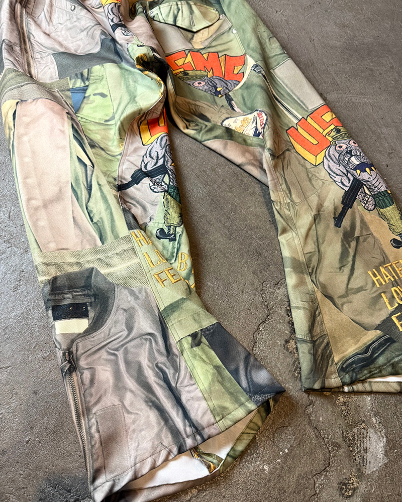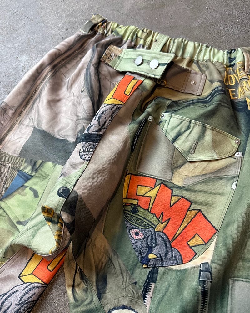 今シーズンの目玉である、juvenile hall rollcallのアーカイブのグラフィックを使用した裏コラボレーションアイテム "3D CUT TROUSERS TROMPE L'OEIL JUV"。