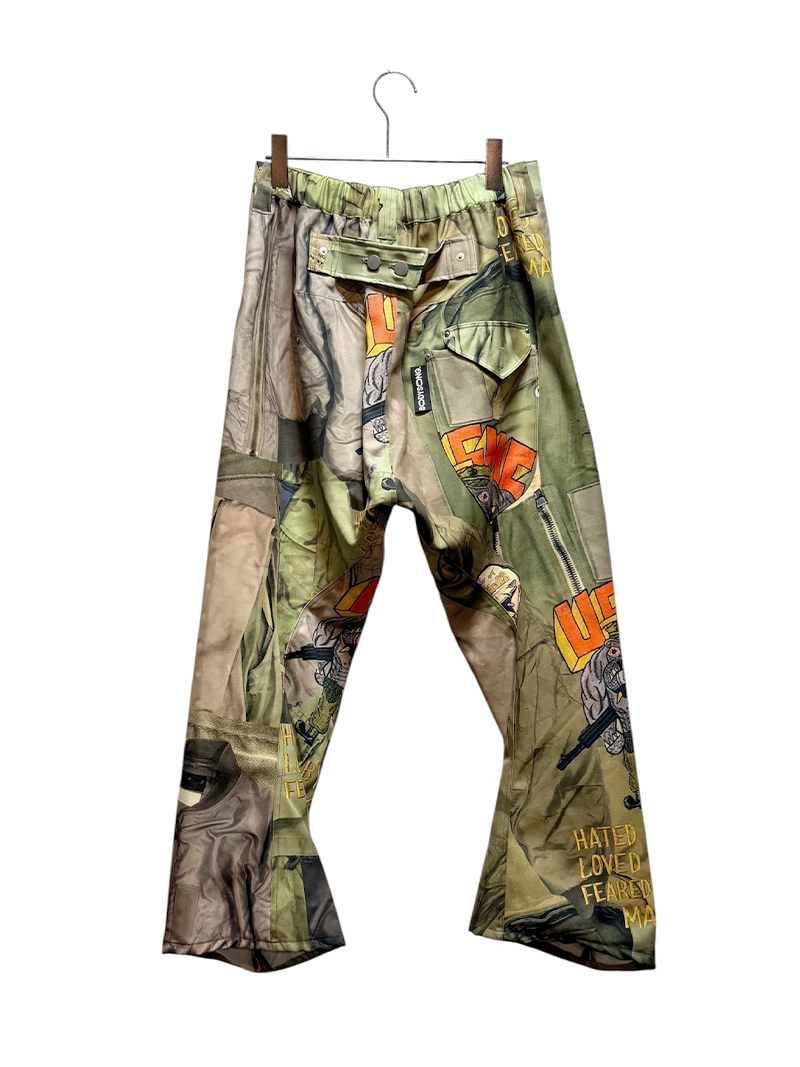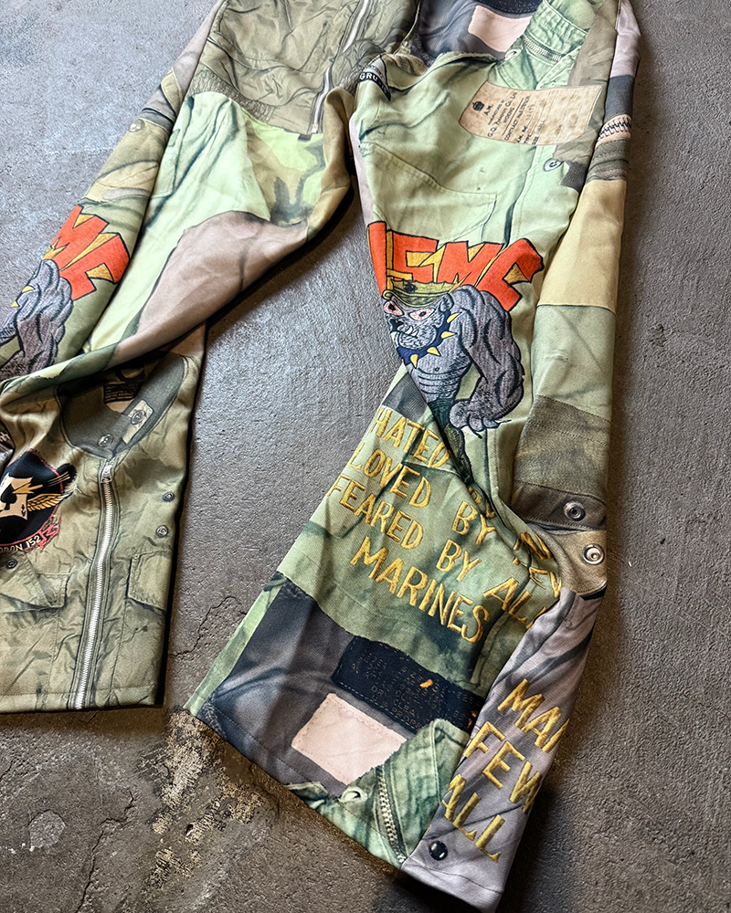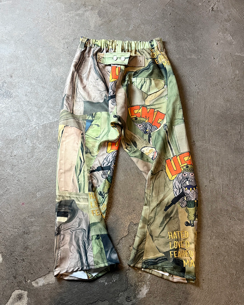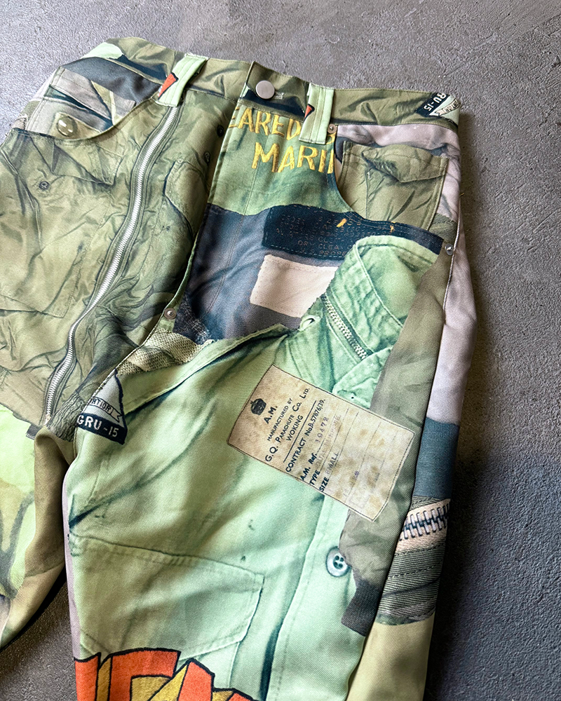 今シーズンの目玉である、juvenile hall rollcallのアーカイブのグラフィックを使用した裏コラボレーションアイテム "3D CUT TROUSERS TROMPE L'OEIL JUV"。