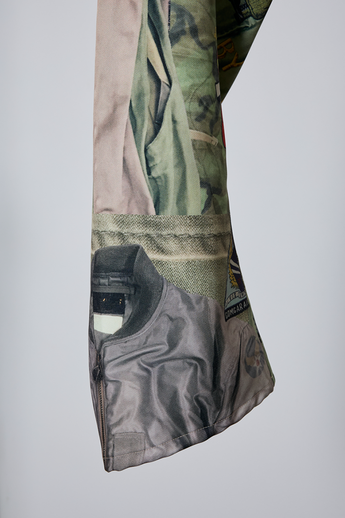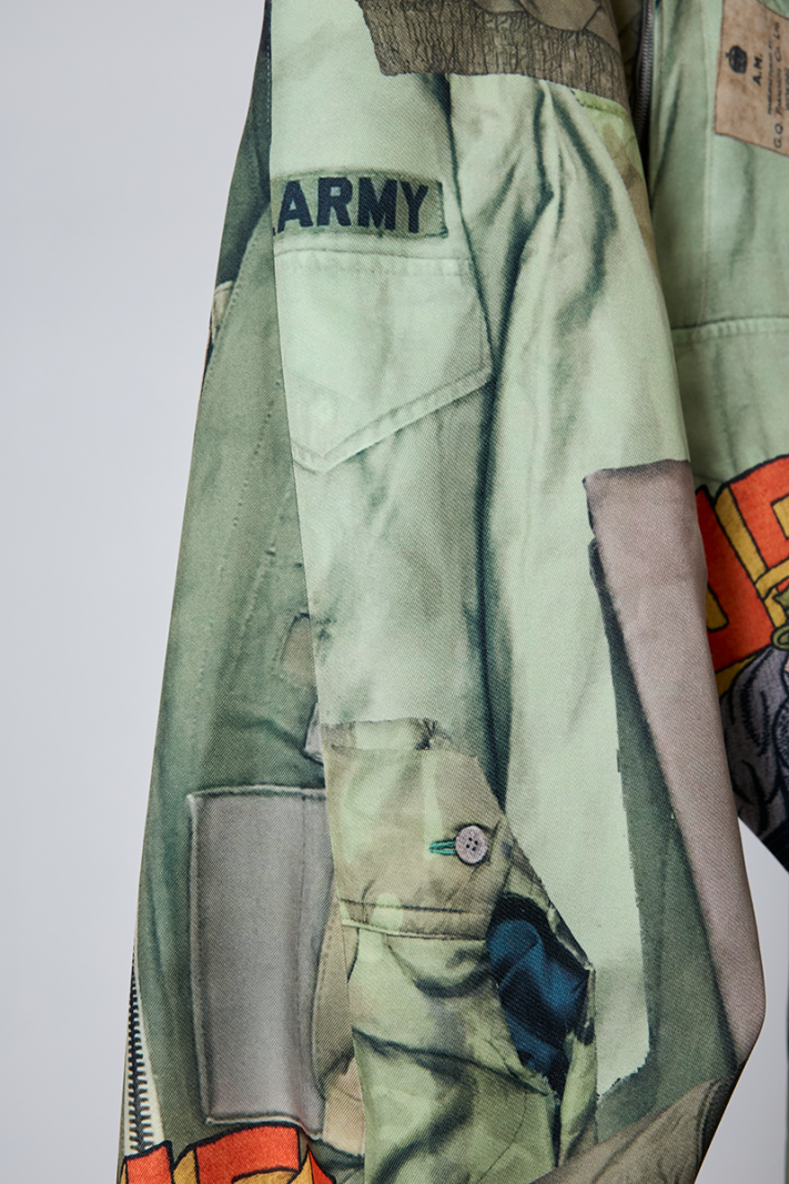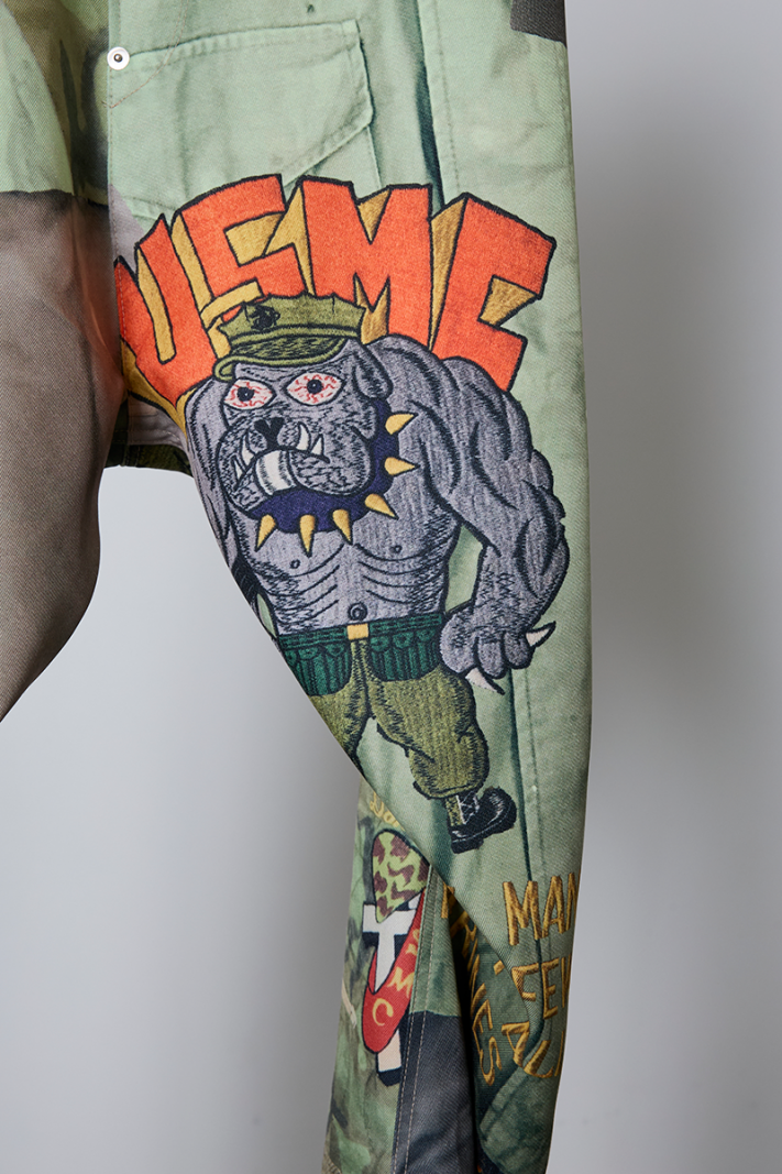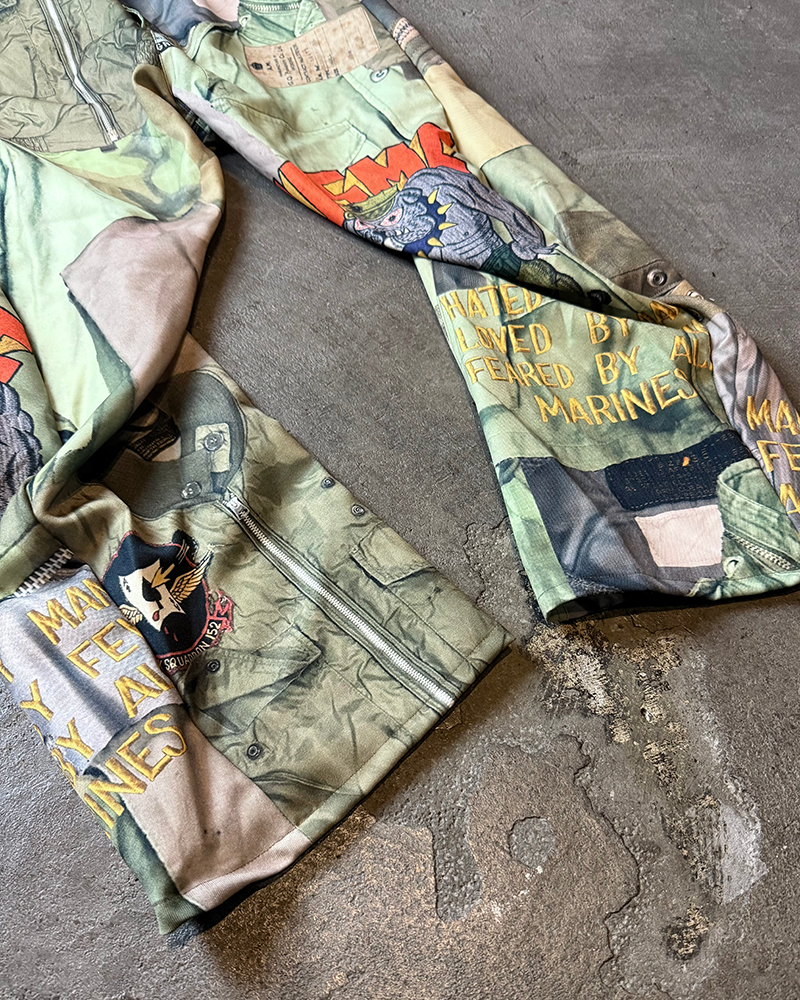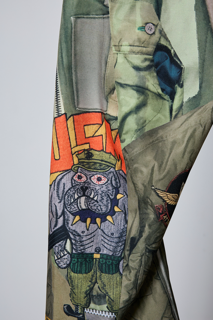 ヴィンテージデニムやワッペン、ピンバッジなどを大胆にコラージュした転写調のグラフィックが存在感抜群の一品。