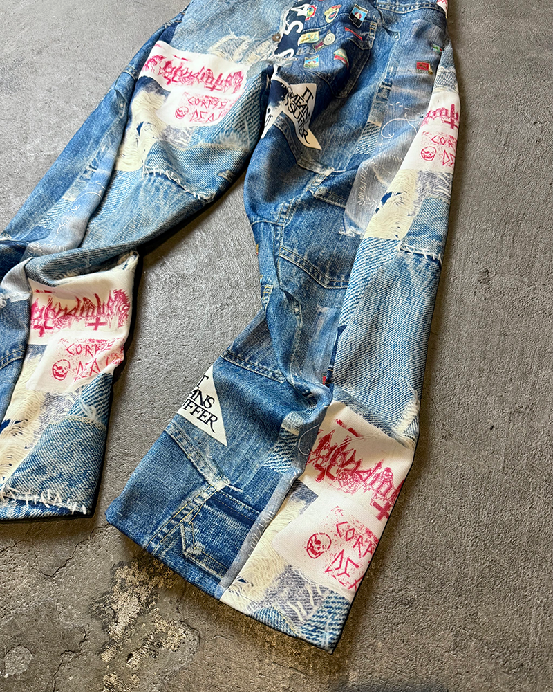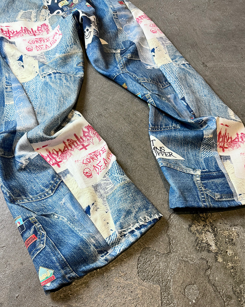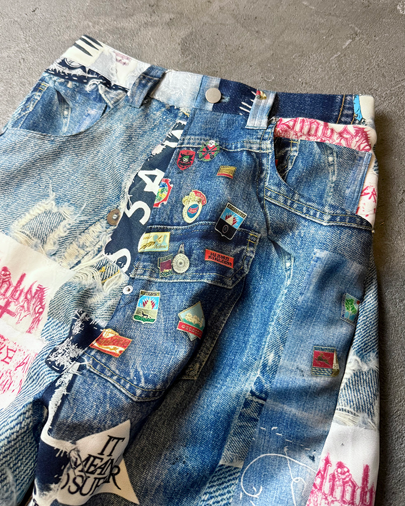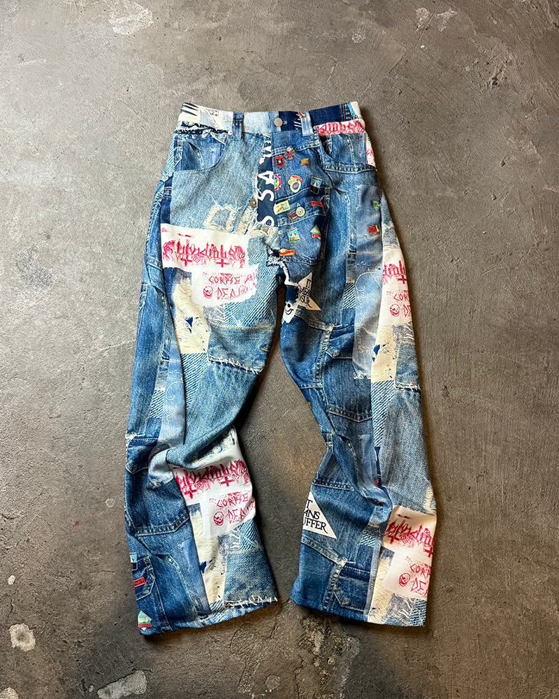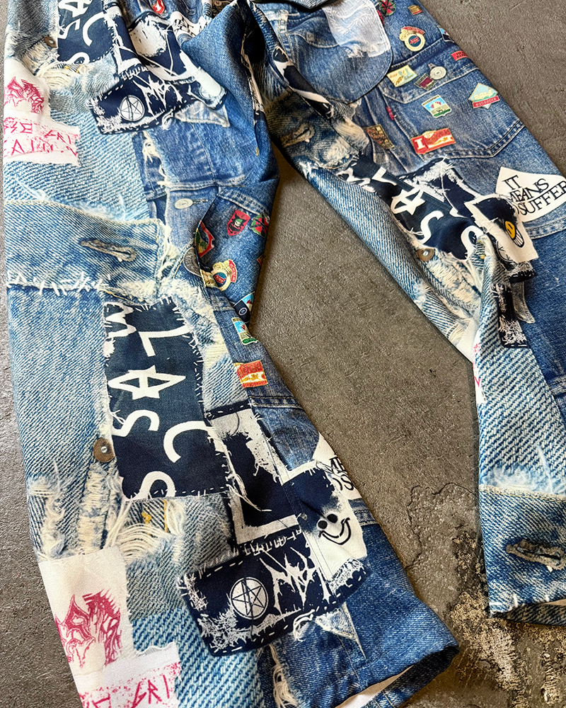 ヴィンテージデニムやワッペン、ピンバッジなどを大胆にコラージュした転写調のグラフィックが存在感抜群の一品。