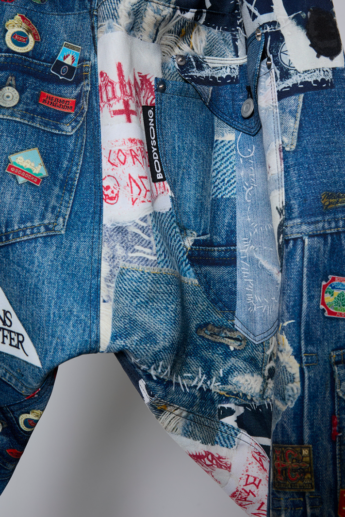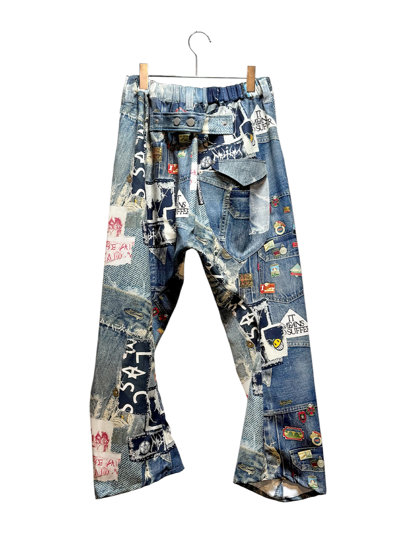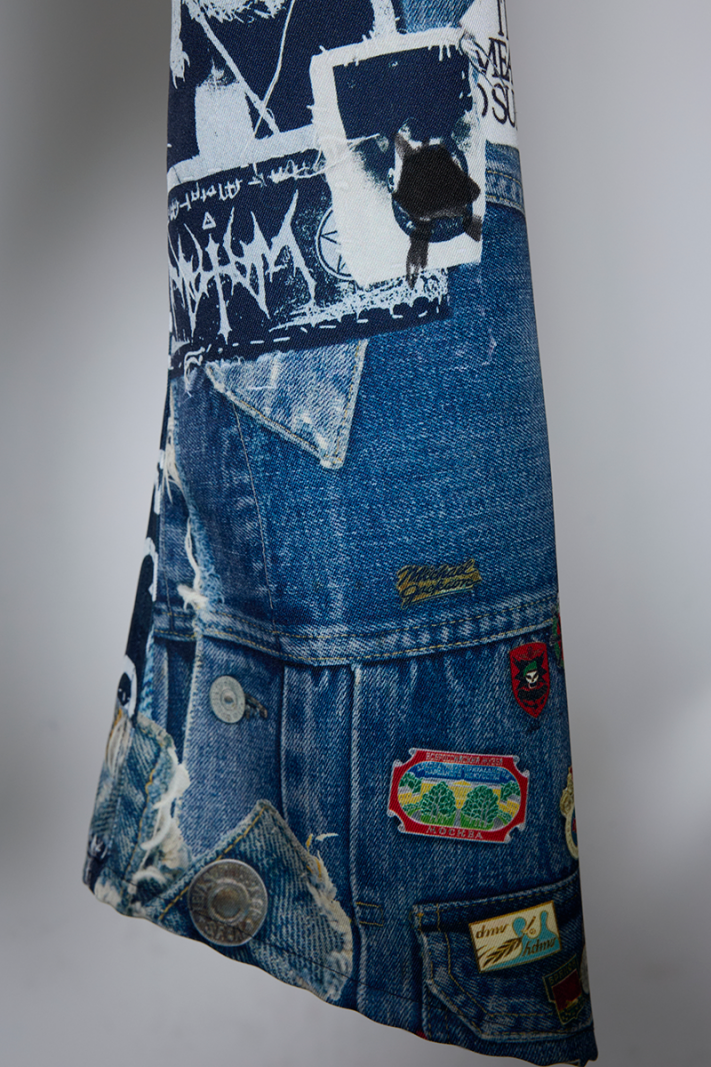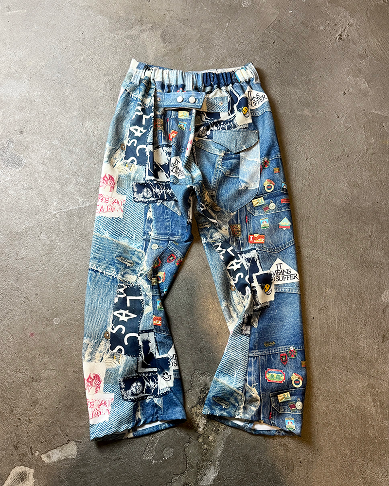 ヴィンテージデニムやワッペン、ピンバッジなどを大胆にコラージュした転写調のグラフィックが存在感抜群の一品。