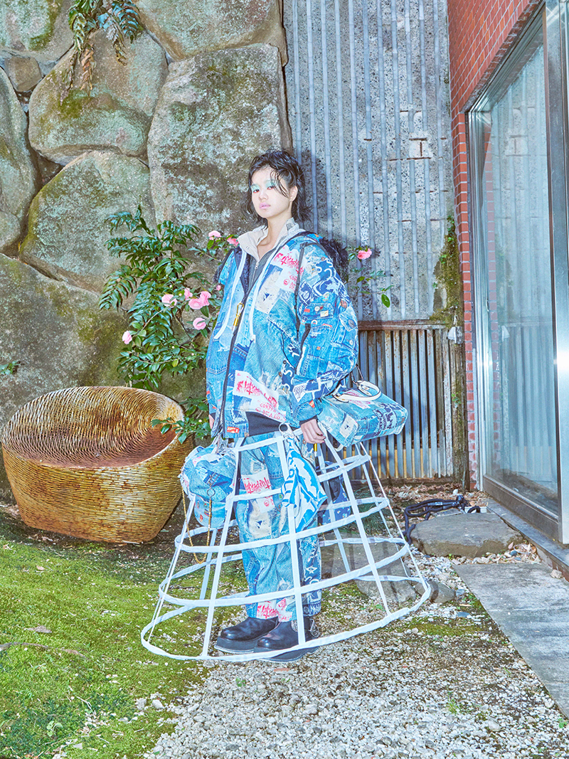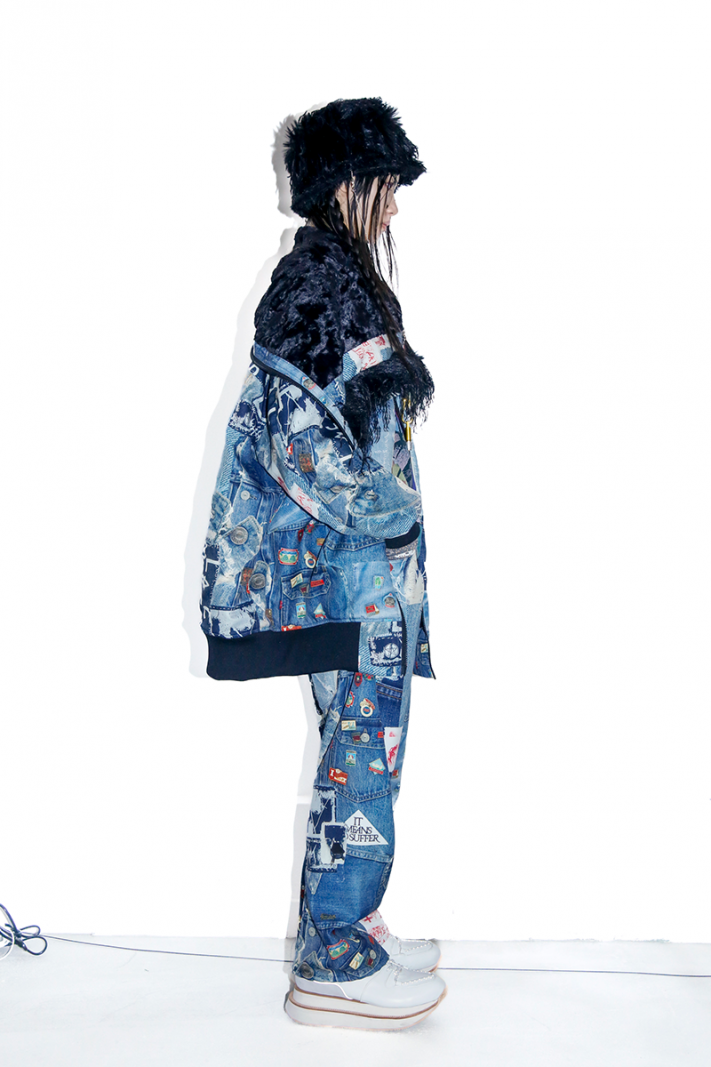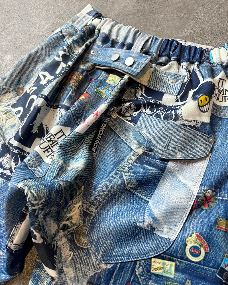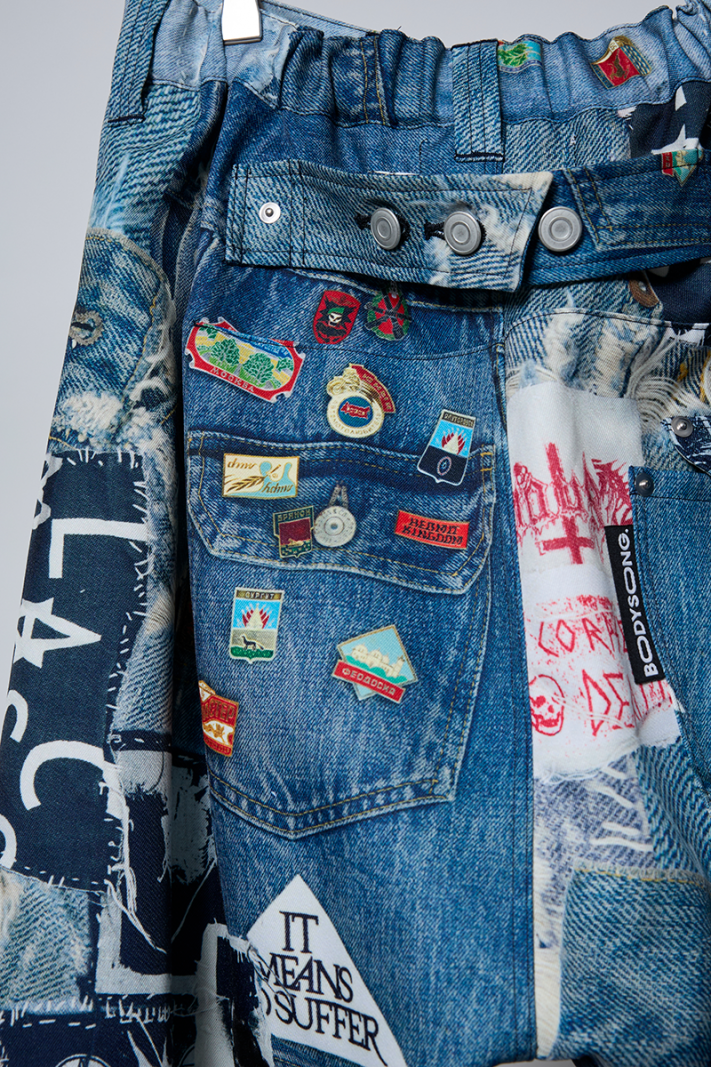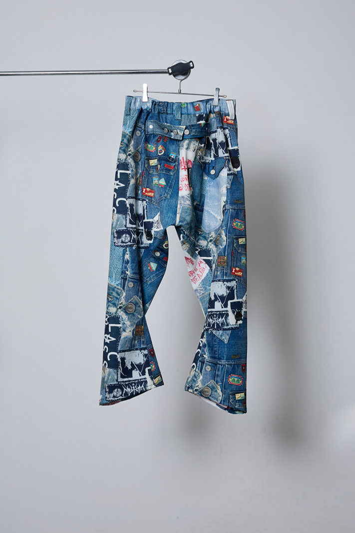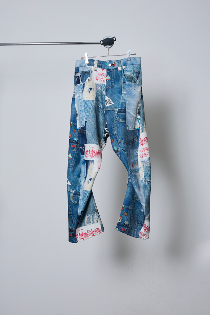 今シーズンの目玉である、juvenile hall rollcallのアーカイブのグラフィックを使用した裏コラボレーションアイテム "3D CUT TROUSERS TROMPE L'OEIL JUV"。