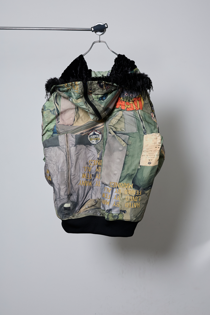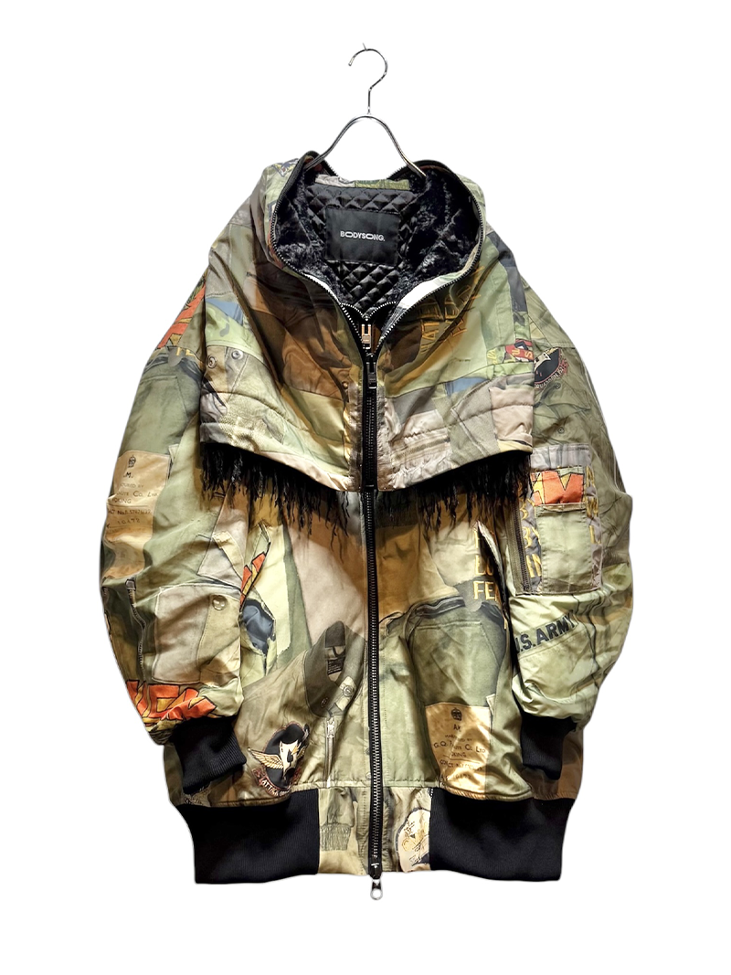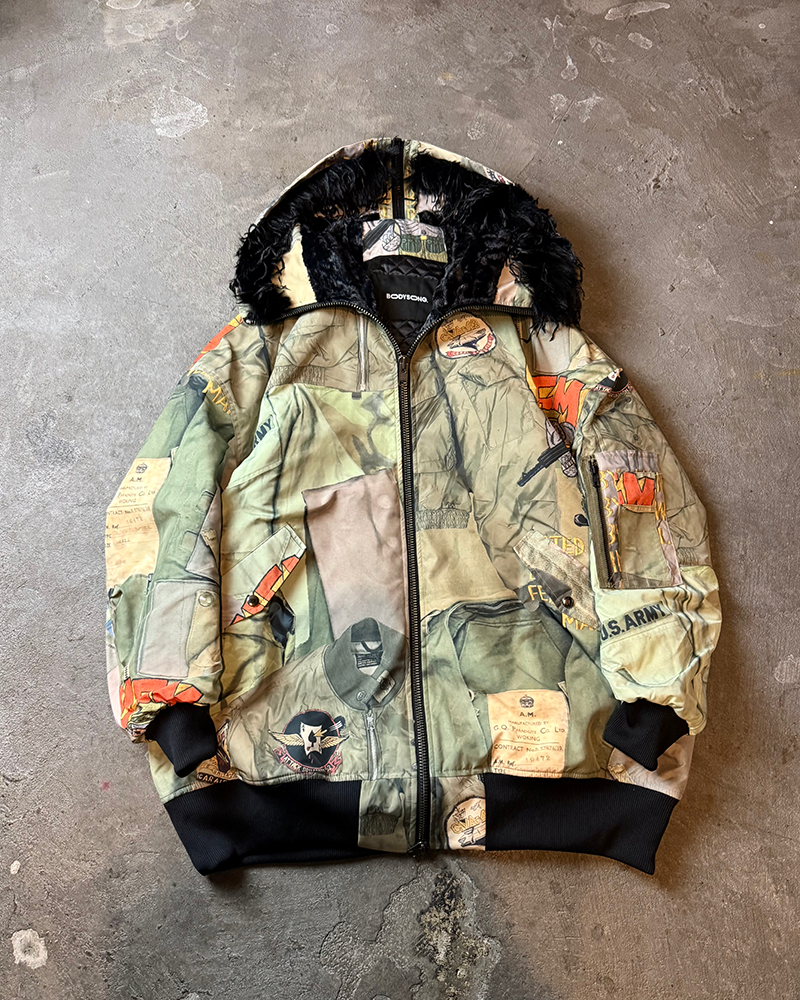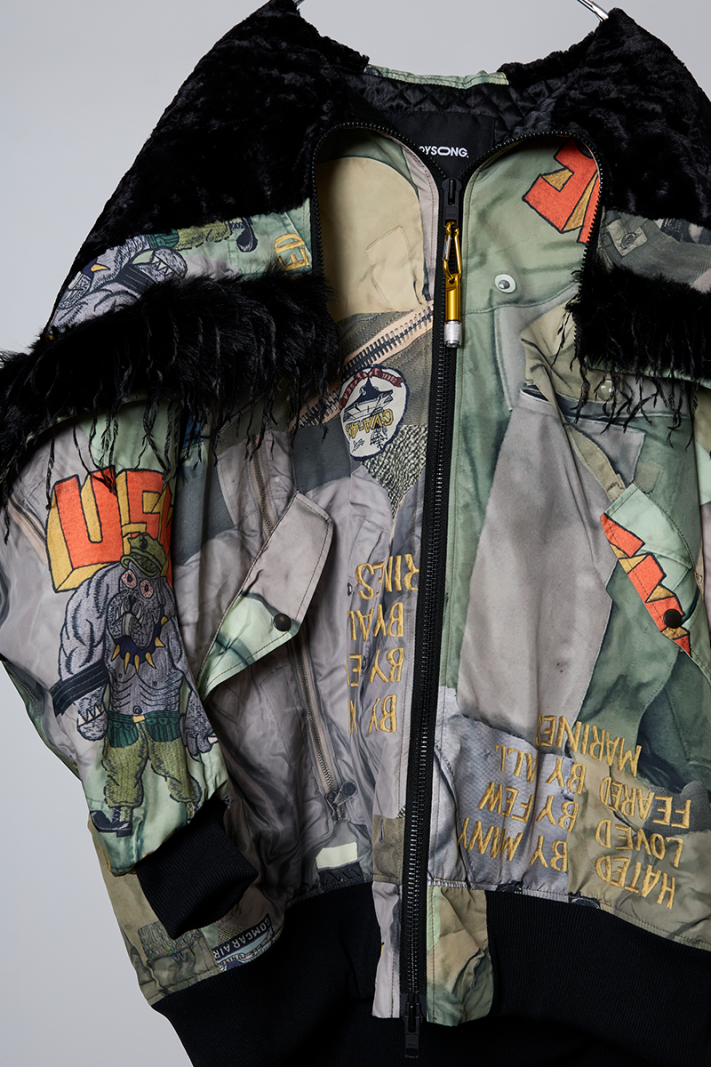 今シーズンの目玉である、juvenile hall rollcallのアーカイブのグラフィックを使用した裏コラボレーションによるアウター、"ROUND SILHOUETTE TROMPE L'OEIL N2B JUV"。
