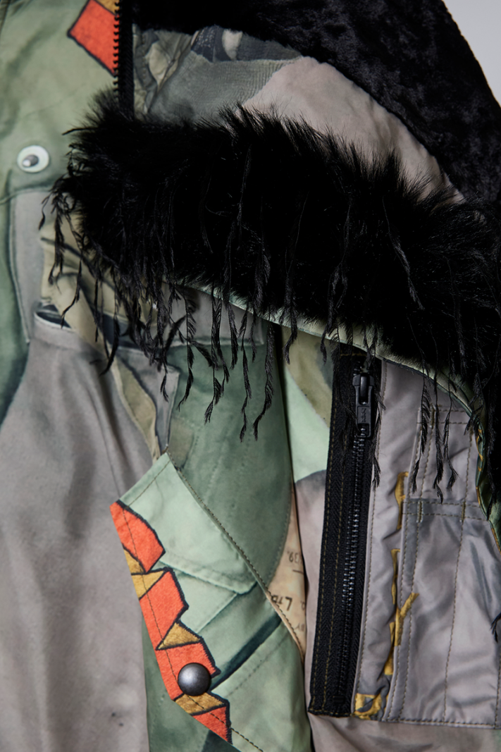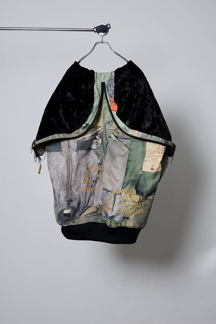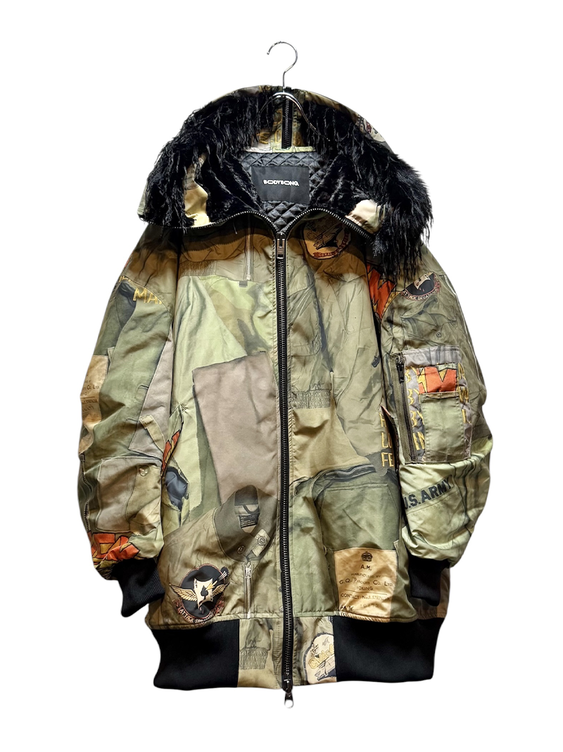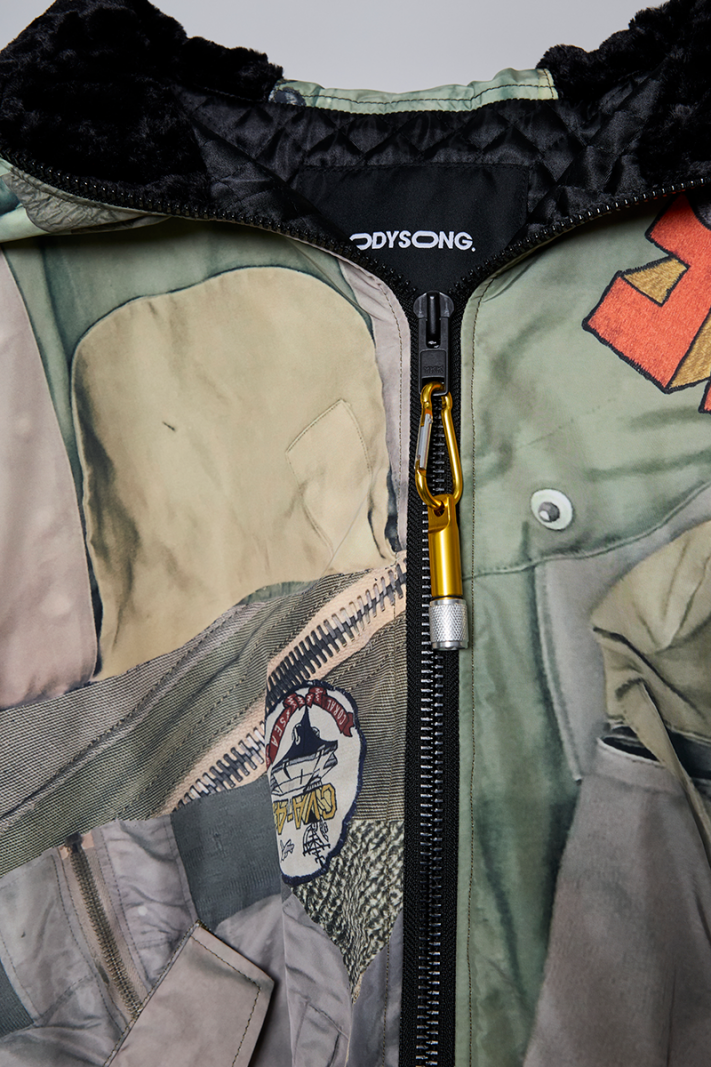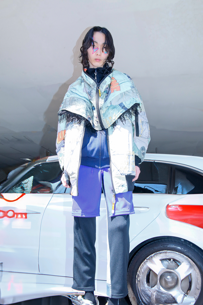 今シーズンの目玉である、juvenile hall rollcallのアーカイブのグラフィックを使用した裏コラボレーションによるアウター、"ROUND SILHOUETTE TROMPE L'OEIL N2B JUV"。