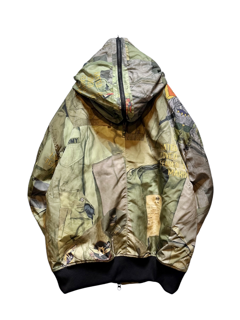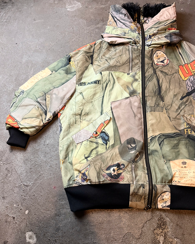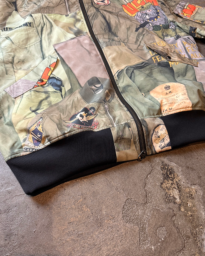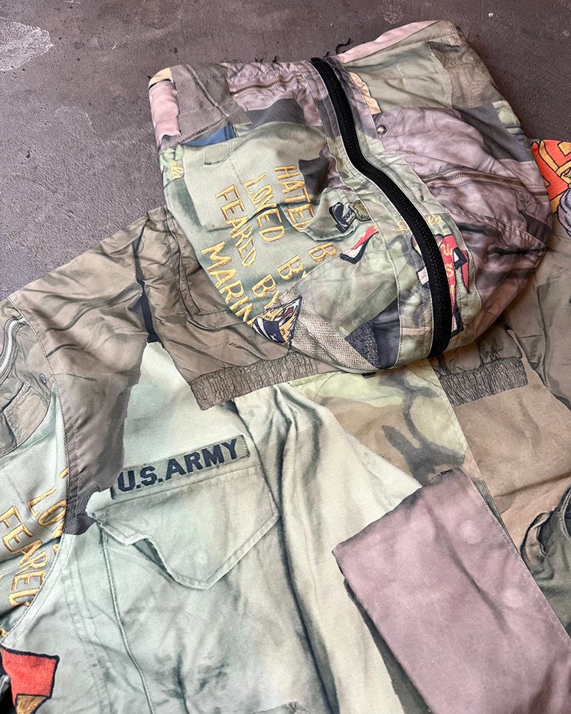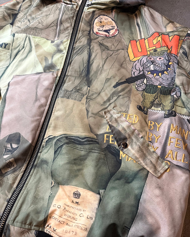 BLUEはヴィンテージデニムやワッペン、ピンバッジなどを、KHAKIは様々なミリタリーウェアを大胆にコラージュした転写調のグラフィックとなった、存在感抜群の一品となっております。