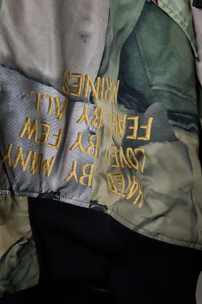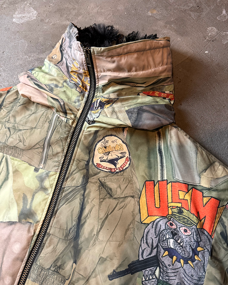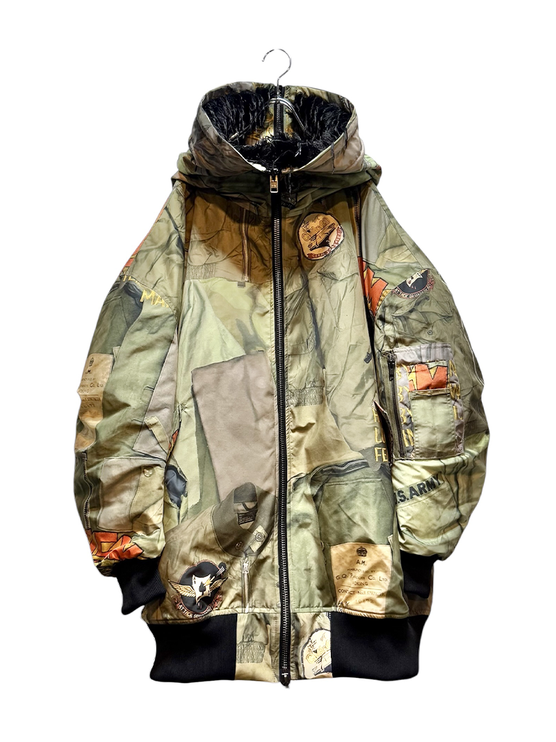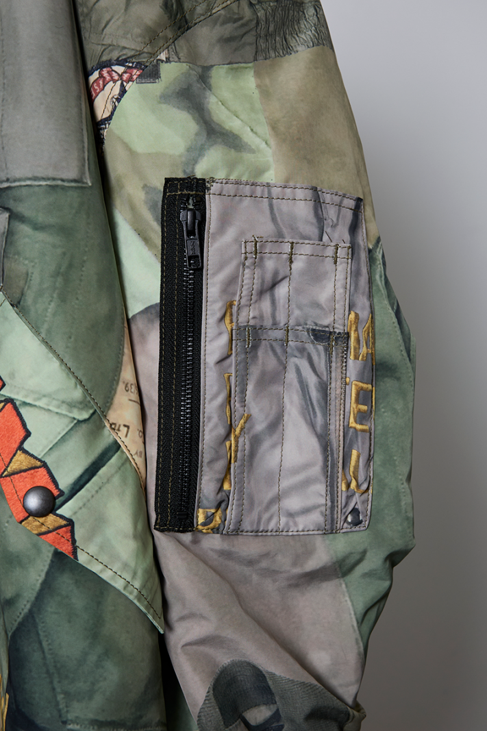 BLUEはヴィンテージデニムやワッペン、ピンバッジなどを、KHAKIは様々なミリタリーウェアを大胆にコラージュした転写調のグラフィックとなった、存在感抜群の一品となっております。