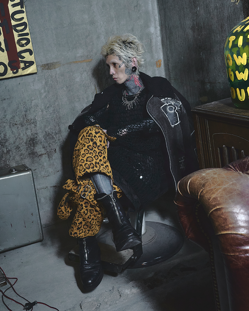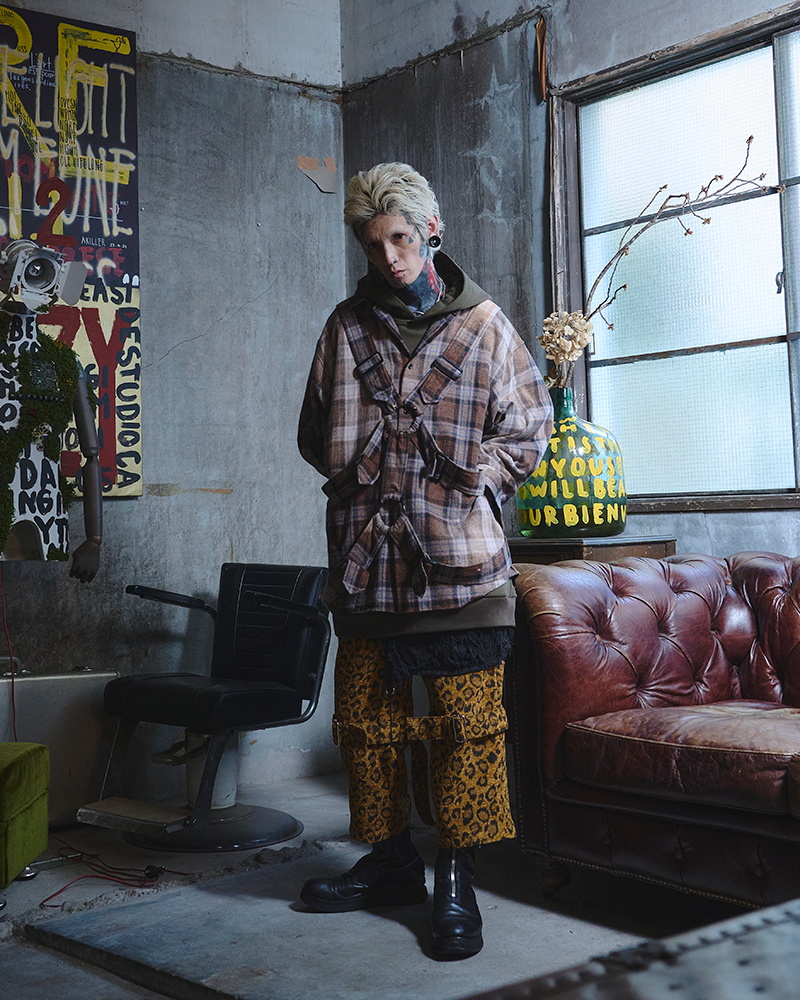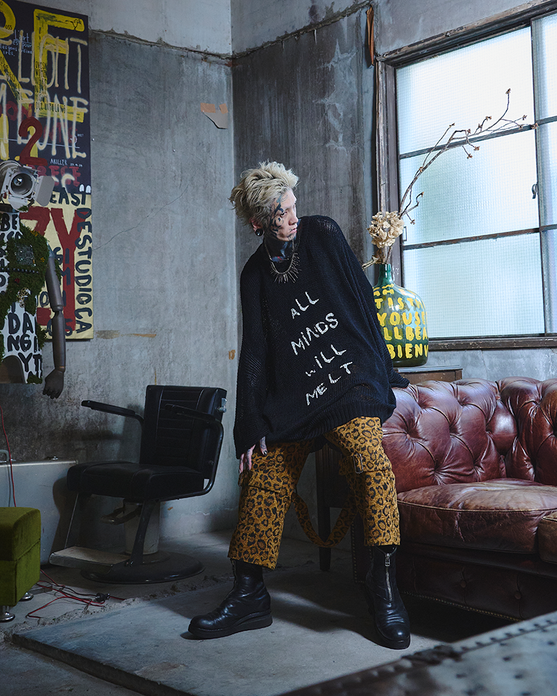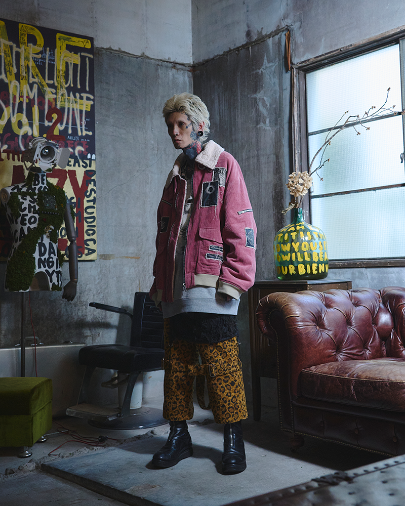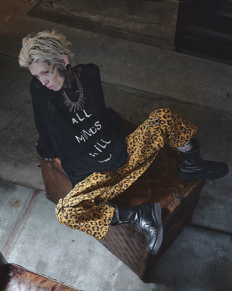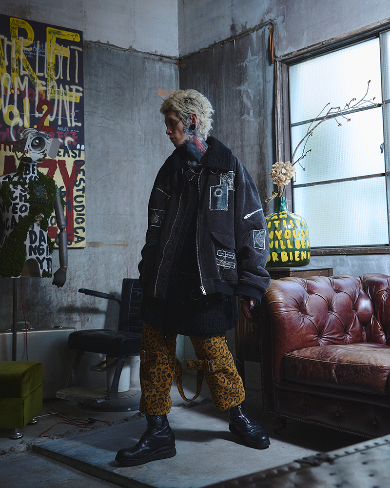 また、クロップド丈のボンテージパンツは過去にも製作してきましたが、こちらはよりシャープな印象にするためパターンを大幅に修正し、ボリューム感を抑えた縦のラインを意識したシルエットにしております。