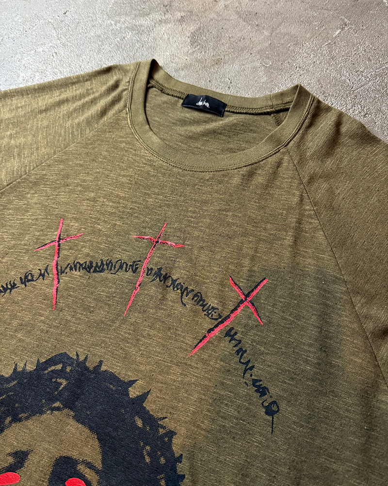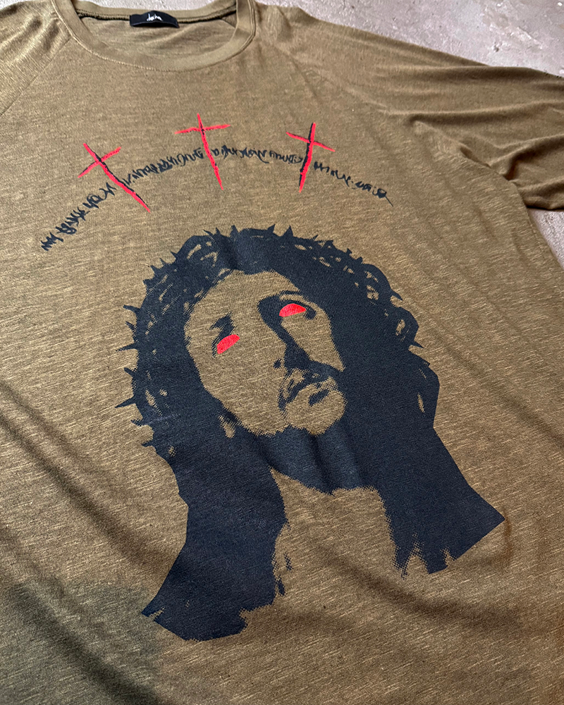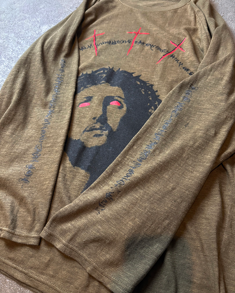 両袖にもプリントを施し、こちらは手刷りによってあえて掠れが出るようにプリントしております。